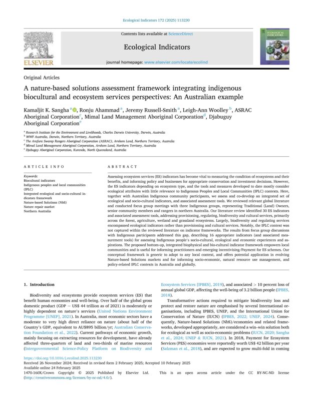 A nature-based solutions assessment framework integrating indigenous biocultural and ecosystem services perspectives: An Australian example.